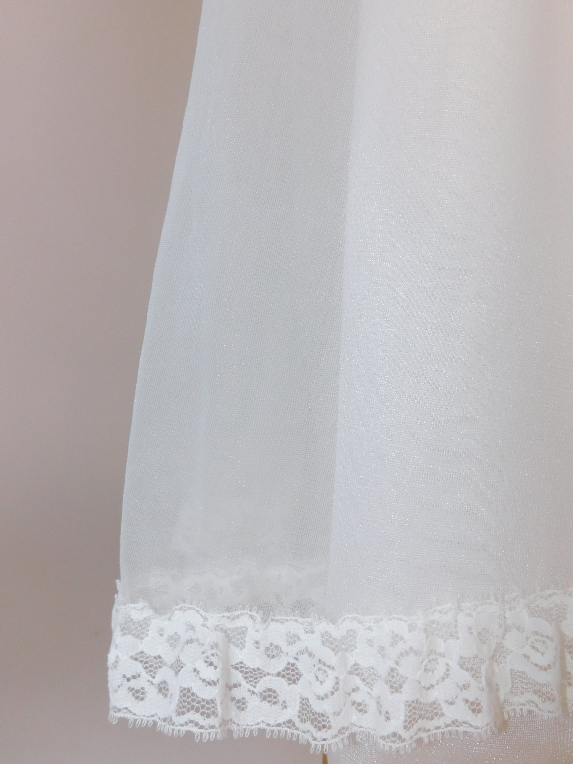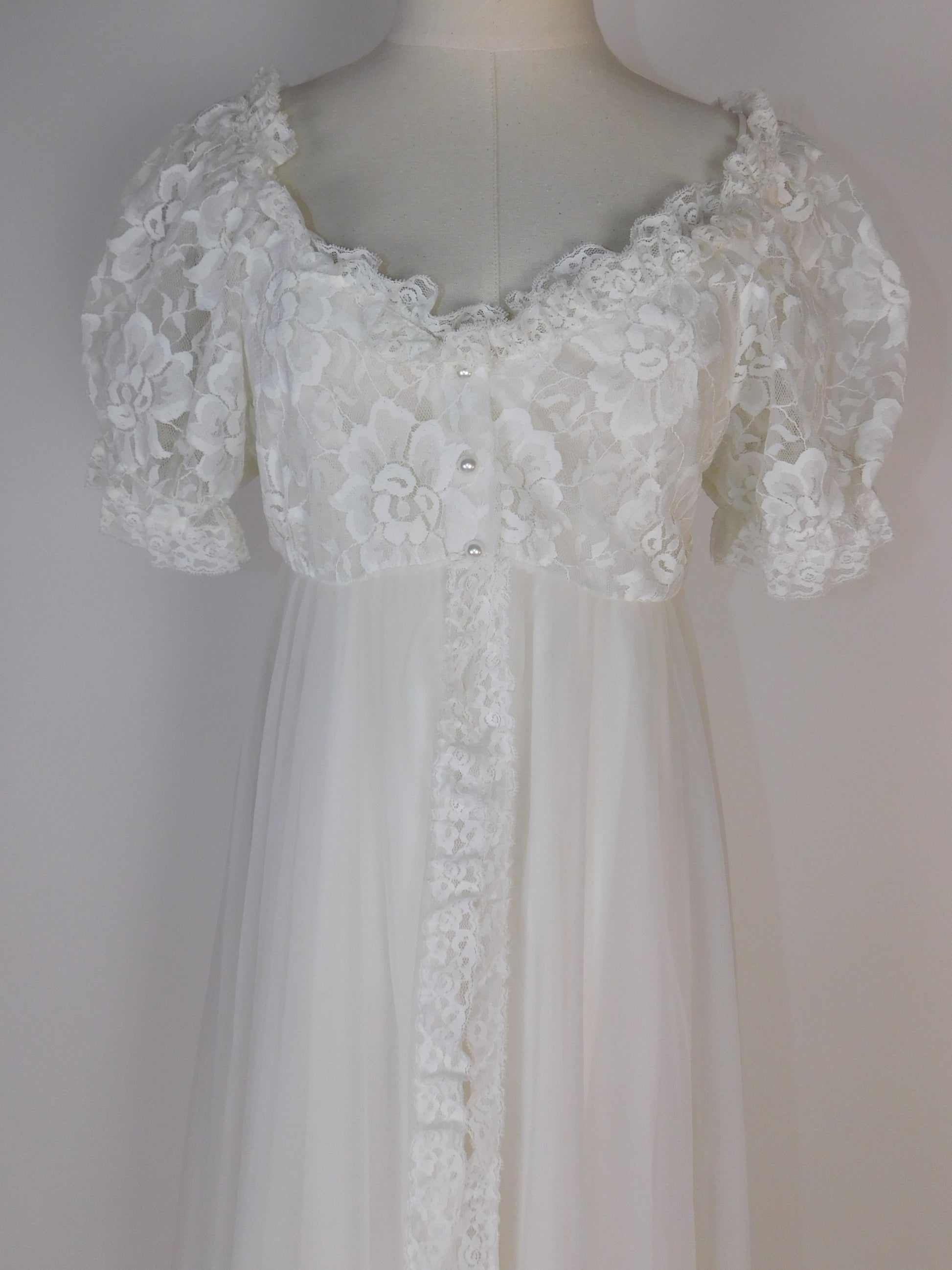 A romantic and rare 1970s bridal peignor set evokes a dreamlike elegance. The nightgown features a sheer floral lace bodice that flatters the neckline, flowing into soft double layer of chiffon that offers graceful movement with light coverage. The matching robe echoes the same sheer lace bodice and is finished with delicate pearl-style buttons and fluttering lace sleeves. The robe is fully removable, allowing for layered styling, or minimal, ethereal silhouette.