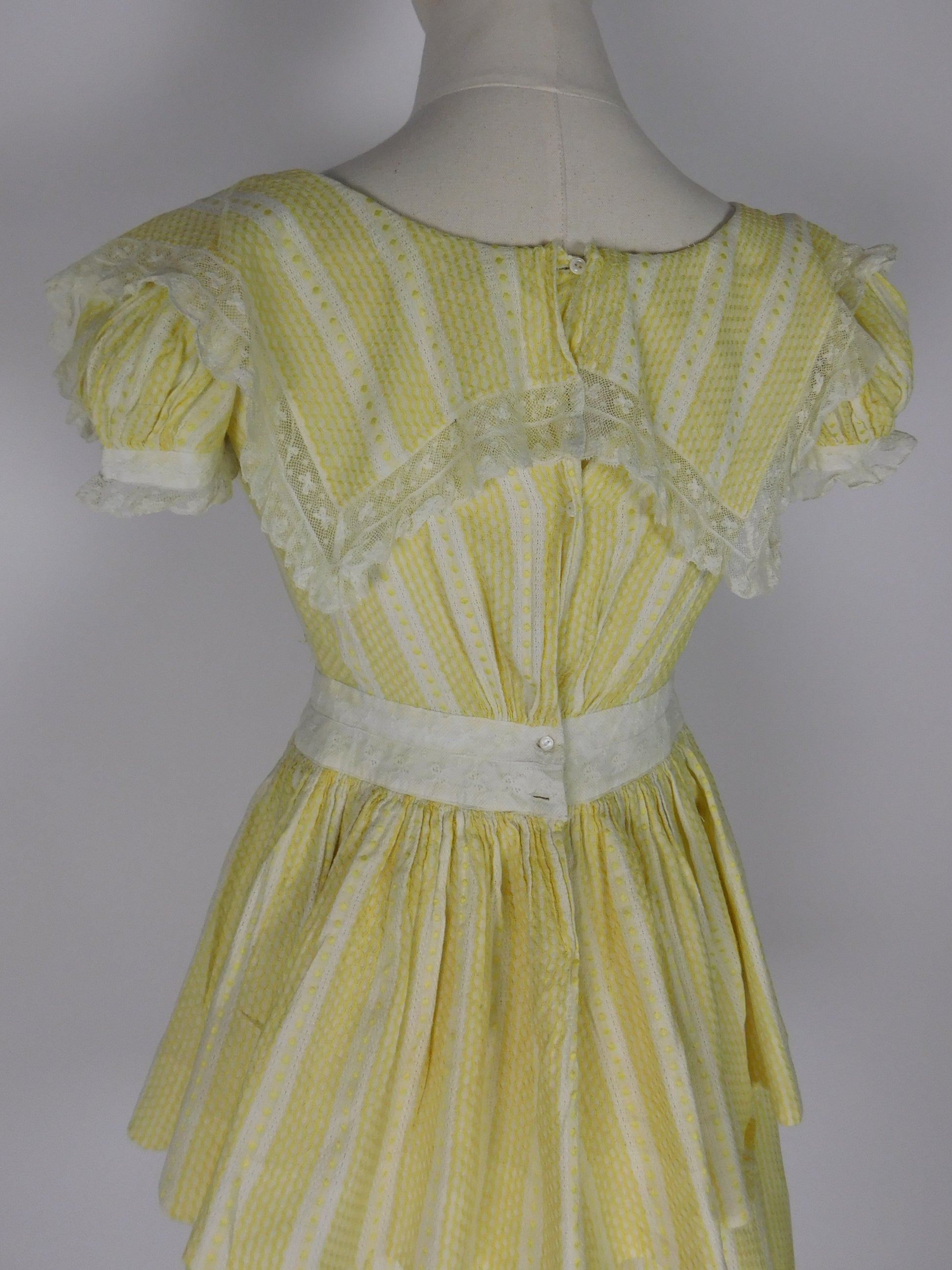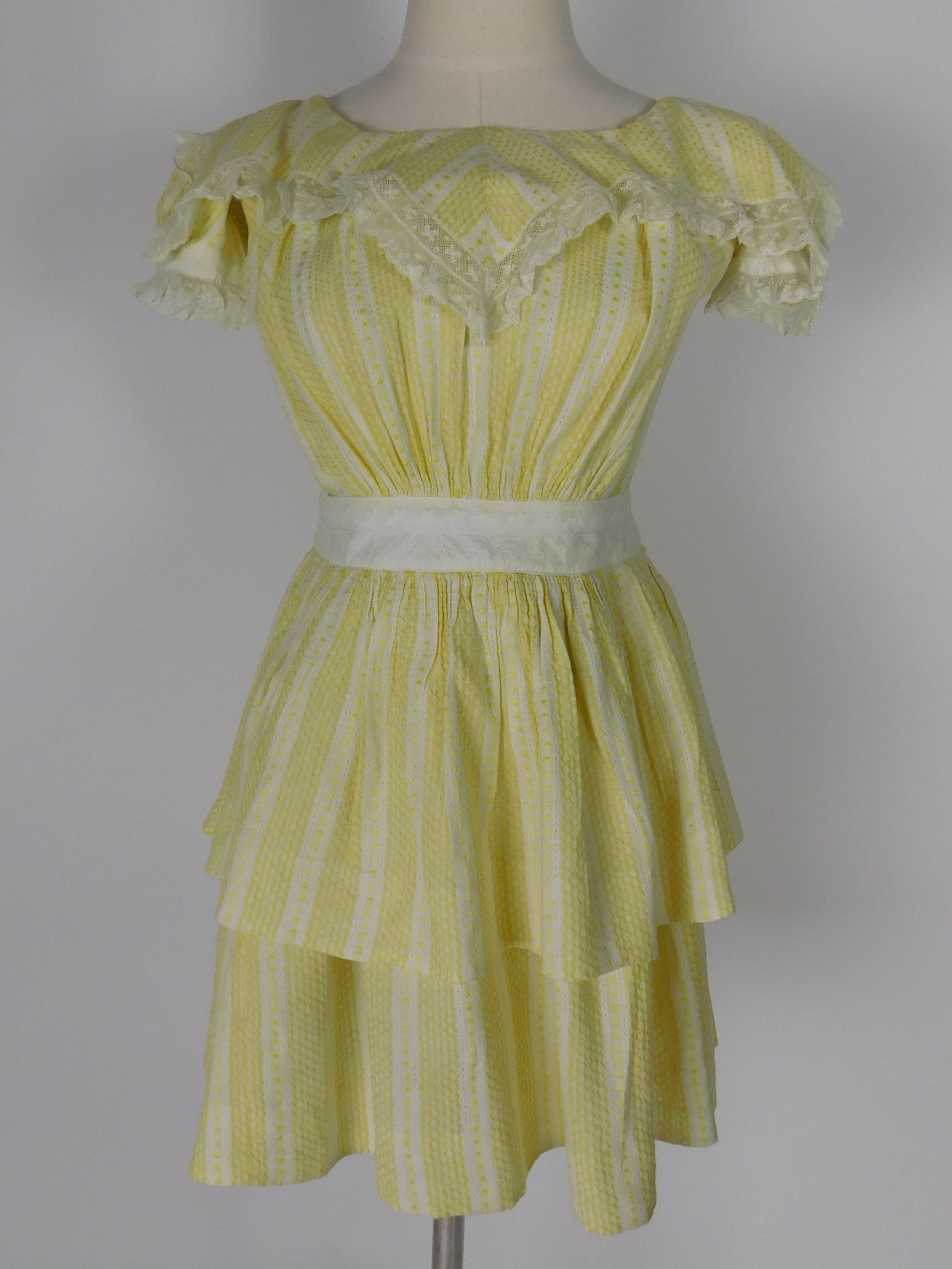 Vintage 1970s prairie revival dress in yellow woven linen with subtle striping. Features a ruffle yoke bodice trimmed in lace, puff sleeves, and a tiered skirt for volume. Buttons down the back. Unlined and lightweight.