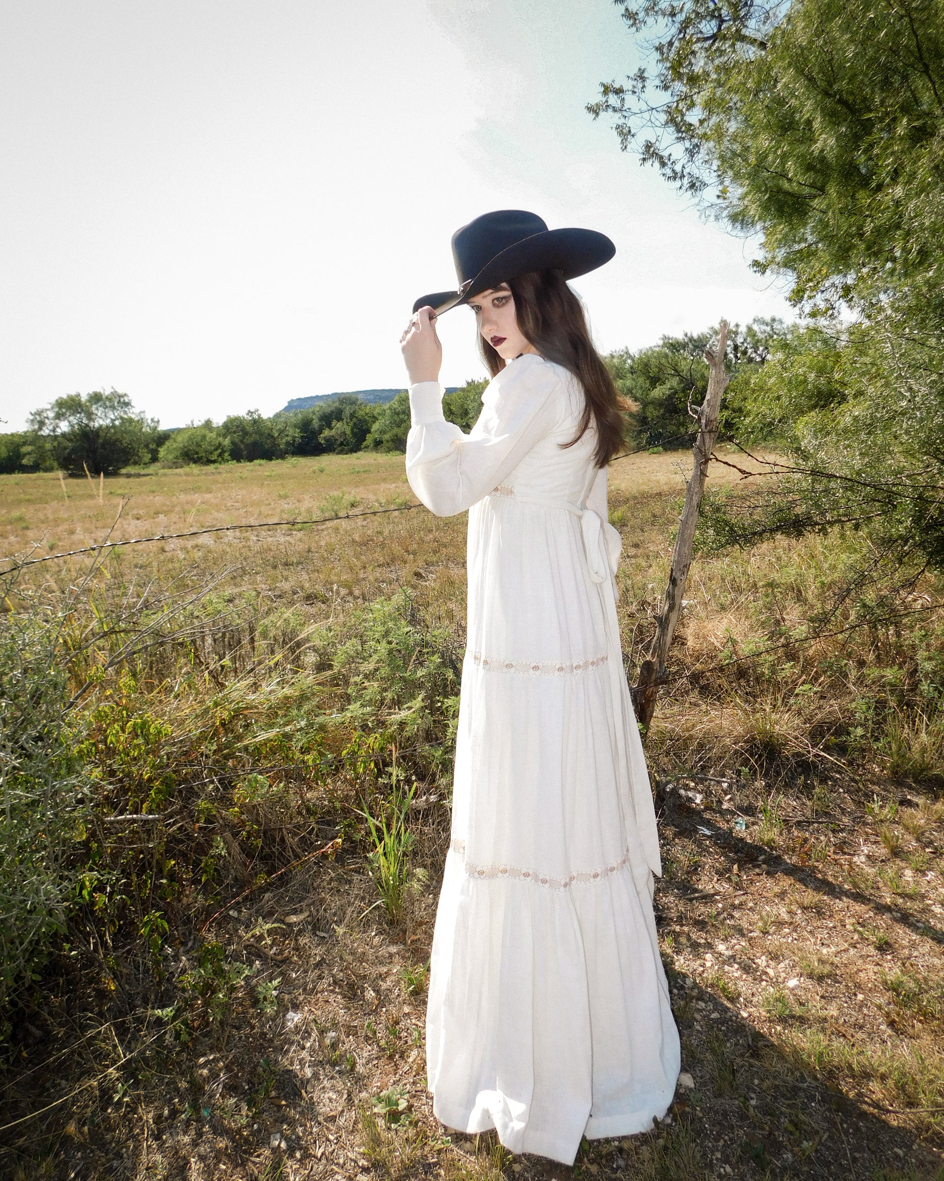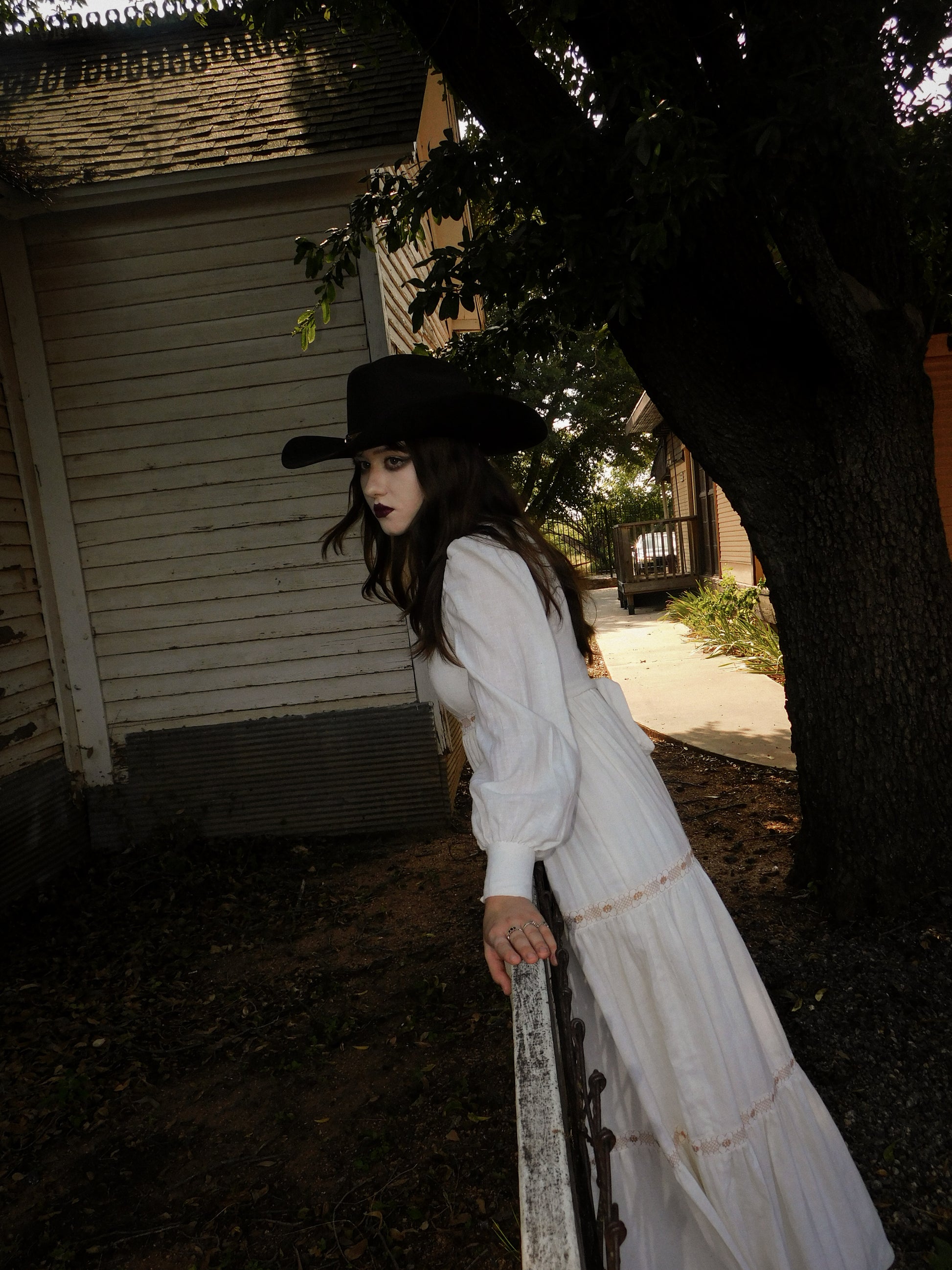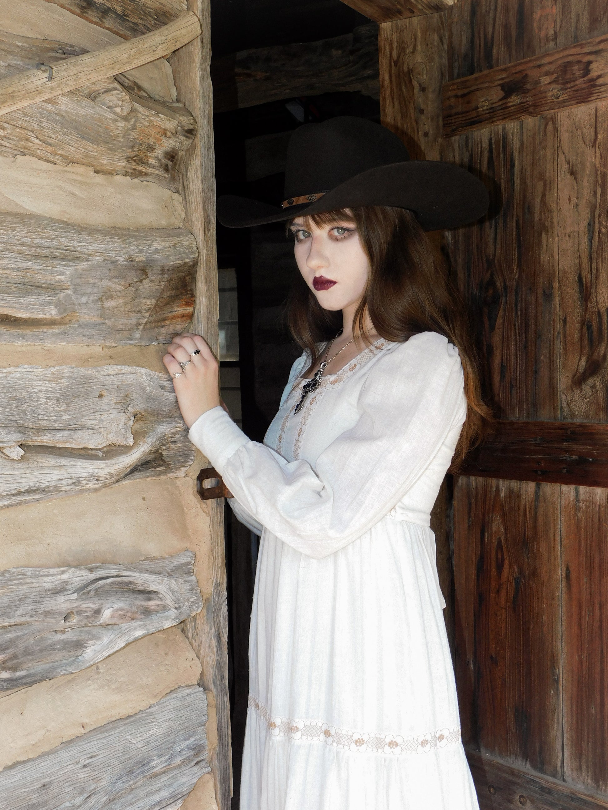 A 1970s vintage prairiee gown in crisp white cotton with lace trim and puff sleeves.strong western ghost town character with gothic prairie energy.