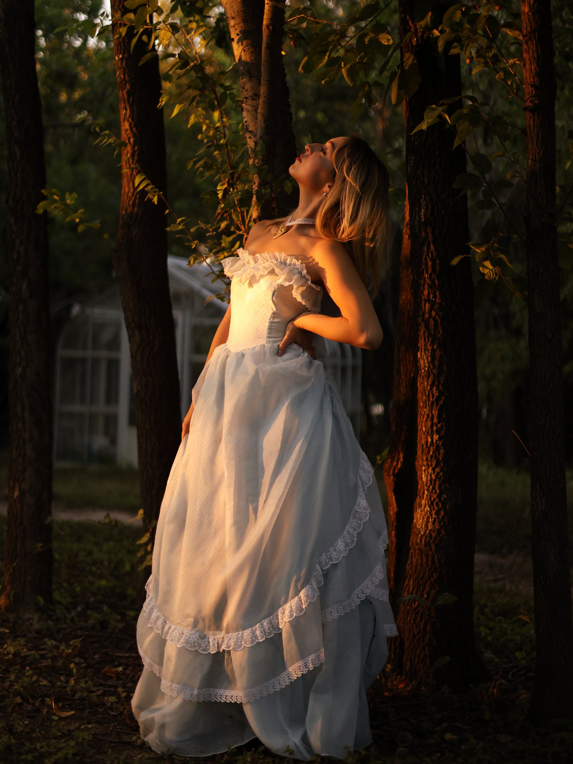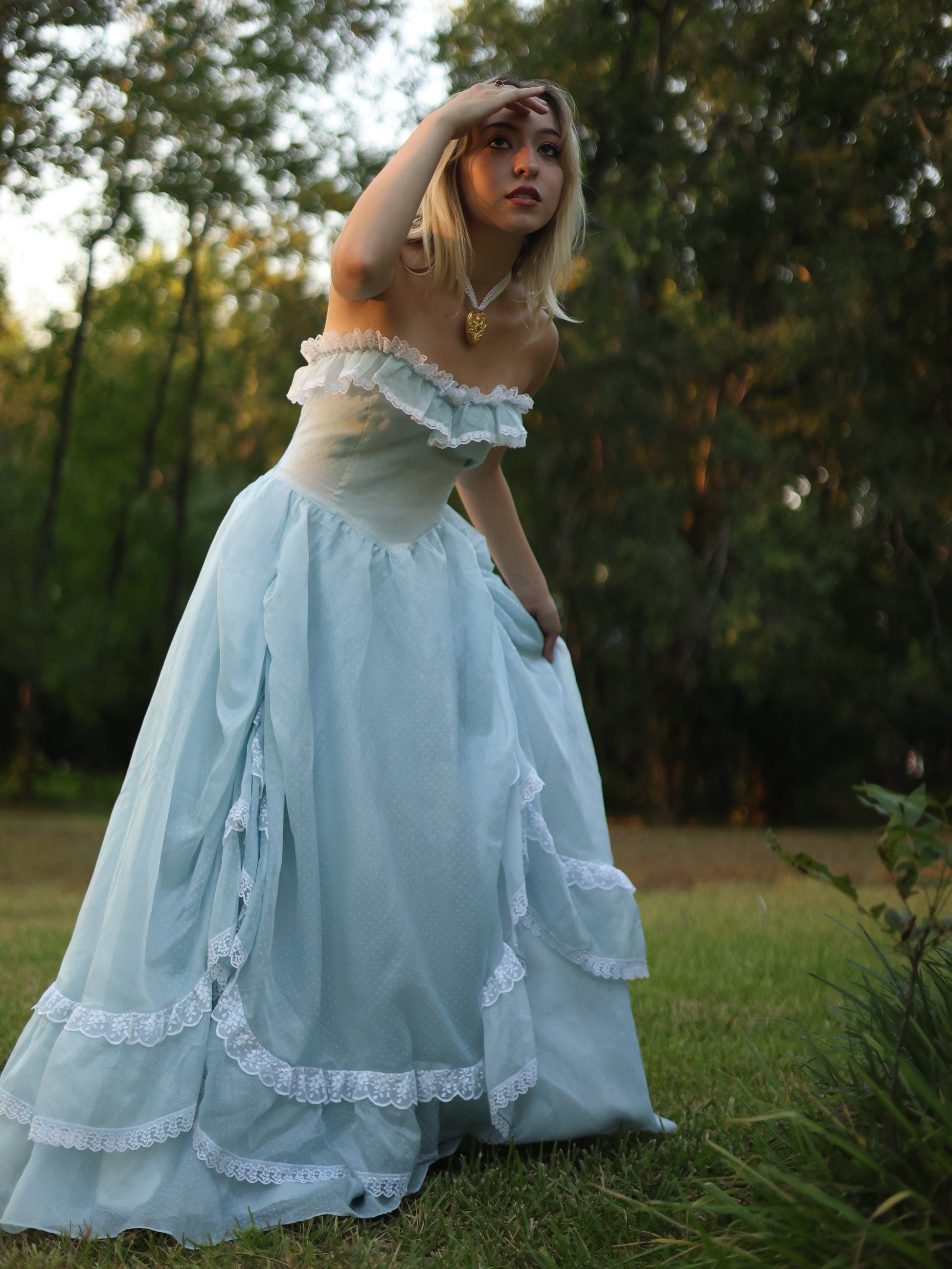 An original Gunne Sax Southern Belle gown in rare pastel blue Swiss-dot fabric trimmed with white lace ruffles and a dramatic back bow. The bodice is fitted and strapless with a softly gathered neckline that gives way to a full layered skirt , cascading with delicate lace tiers. This silhouette captures the spirit of 1970s prairie revival and Victorian romance, making it an heirloom piece for collectors. The gown features a structured bodice with a flattering nipped waist and a sweeping floor-length skirt.