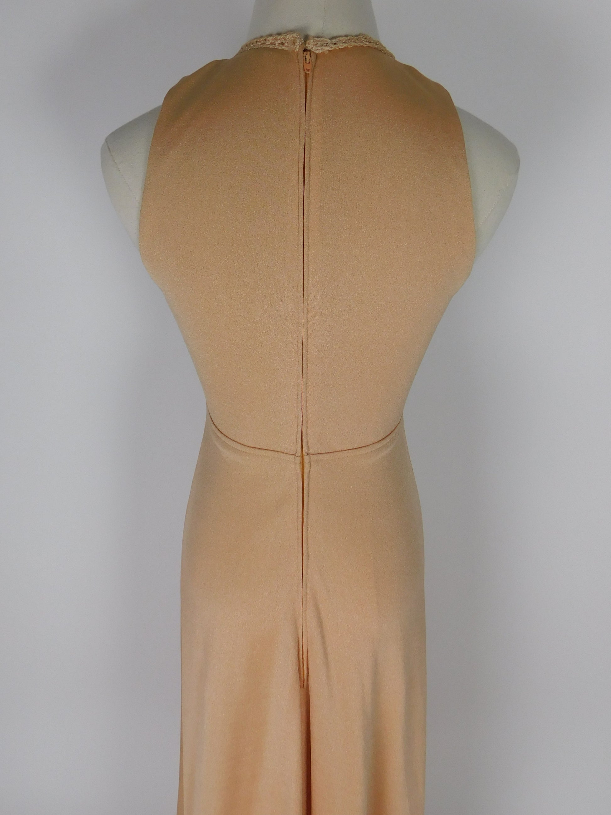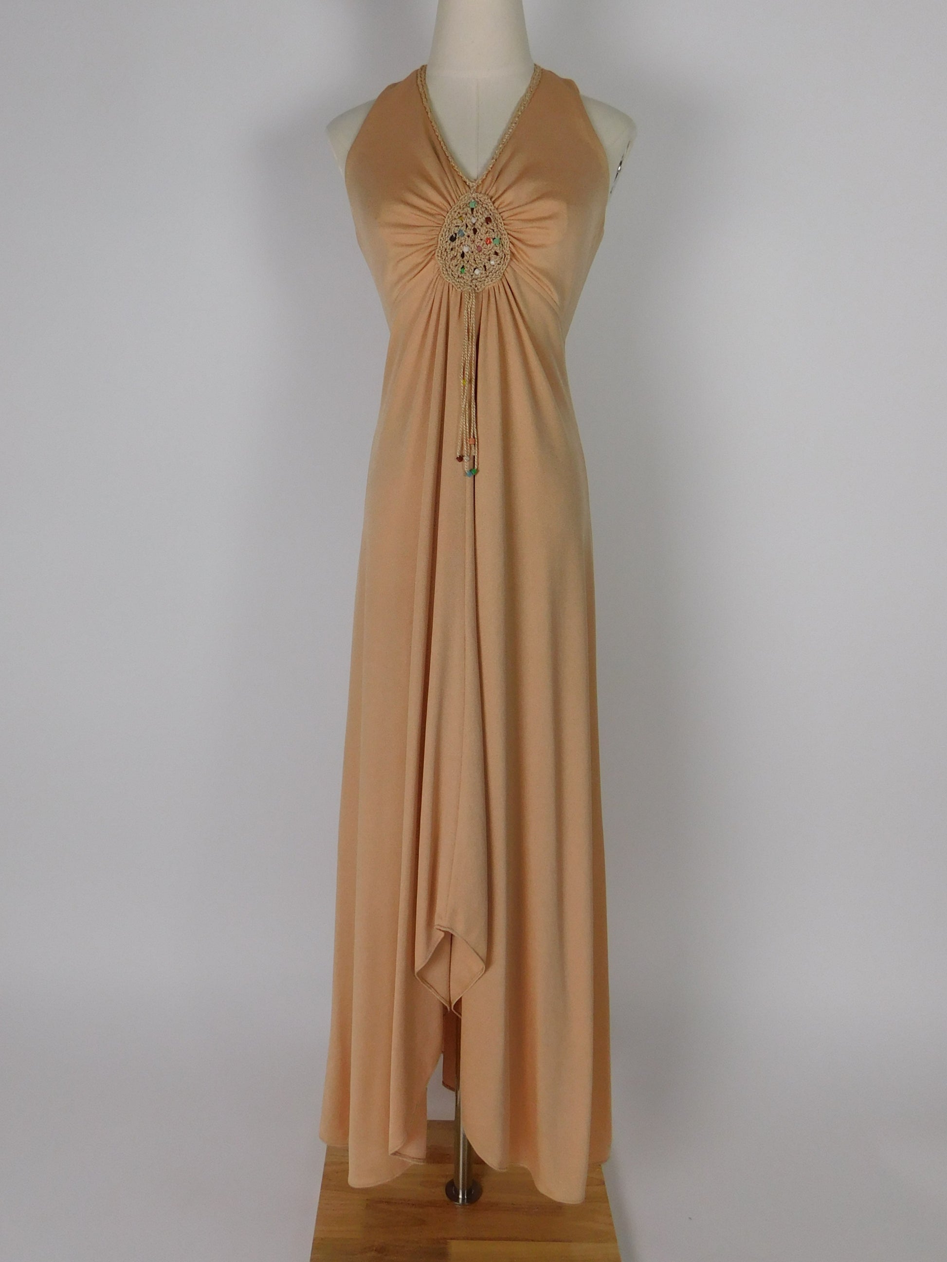Vintage 1970s camel knit maxi dress with a plunging neckline gathered at a crocheted medallion studded with beads. Sleeveless, floor-length, and made from slinky 1970s knit fabric with effortless movement. The earthy tone and retro detailing give it a true 70s bohemian spirit.